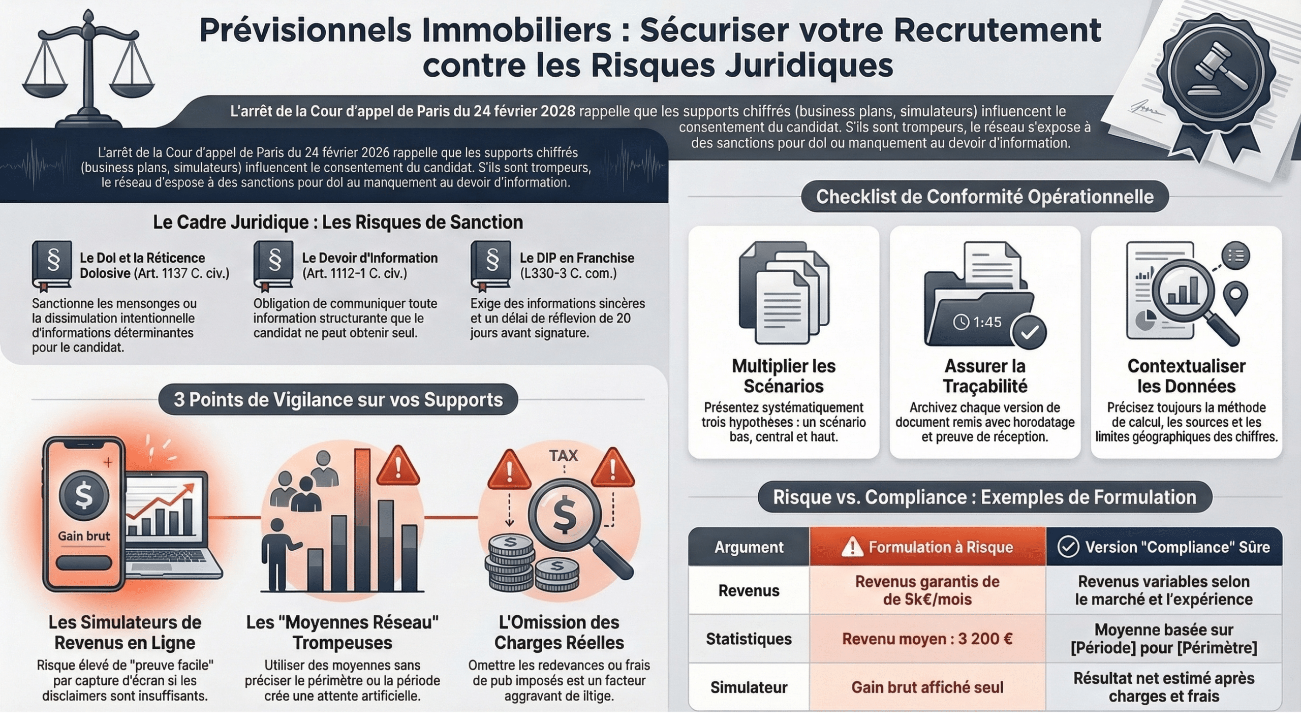 L’arrêt CA Paris du 24 février 2026 (Pôle 5 ch. 16, RG 24/15487) rappelle la sensibilité contentieuse des réseaux immobiliers sur la phase précontractuelle, notamment lorsque des supports chiffrés (business plan, simulateurs) influencent la décision de signer. Les réseaux doivent sécuriser leurs prévisionnels au regard du dol (art. 1137 C. civ.) et du devoir d’information (art. 1112-1 C. civ.), et en franchise respecter strictement le DIP (L330-3 et R330-1 C. com.).