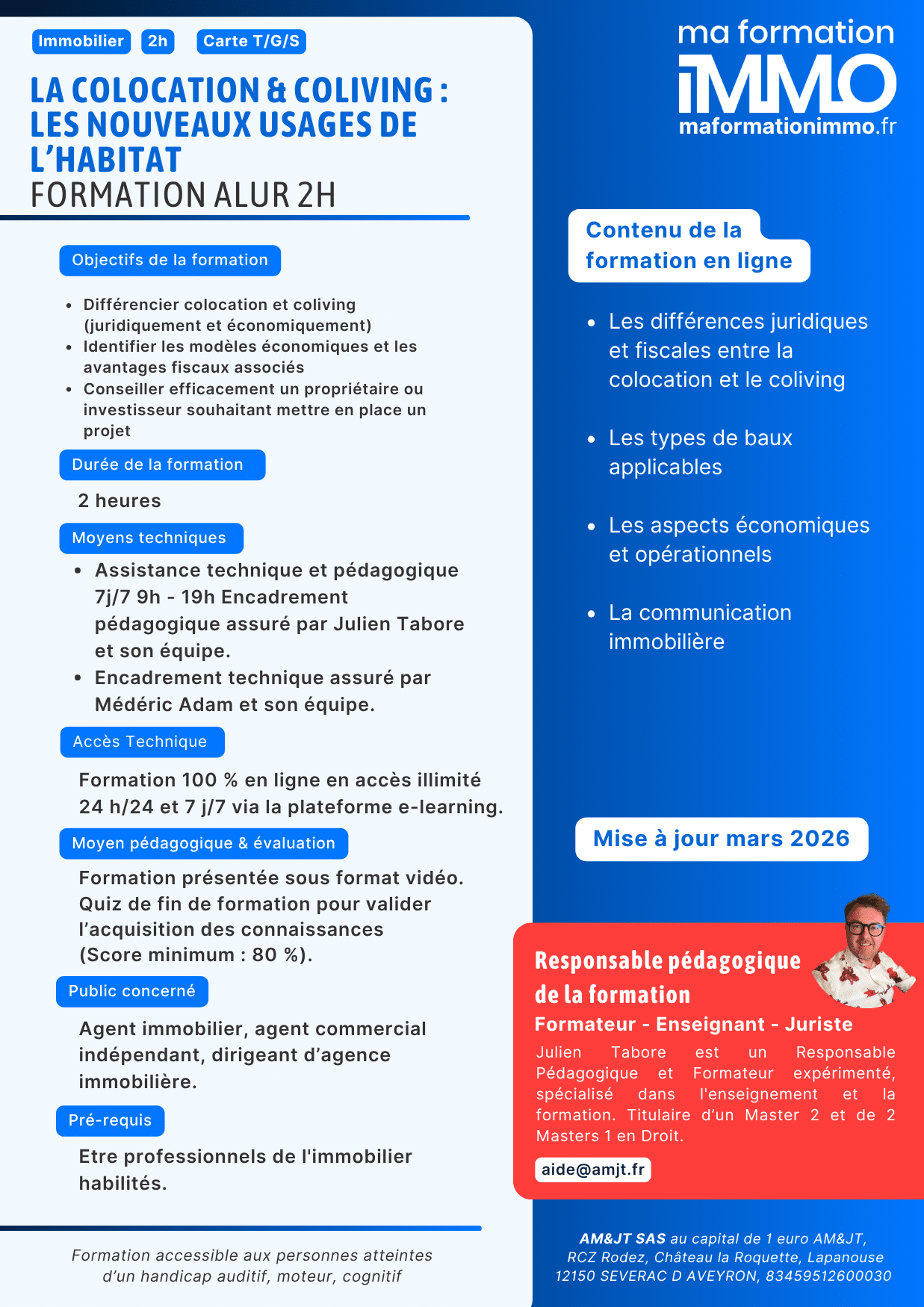 - Cette formation de deux heures sur la colocation et le coliving, conforme aux exigences de la loi ALUR, permet aux professionnels de l’immobilier de maîtriser les nouveaux modèles d’habitat partagé qui transforment le marché locatif. Elle explique en détail les différences juridiques et fiscales entre la colocation et le coliving, les types de baux applicables (bail unique, baux individuels, bail mobilité, sous-location professionnelle) et les régimes fiscaux associés (LMNP, micro-BIC, réel). La formation aborde également les aspects économiques et opérationnels : rentabilité comparée, gestion des risques, organisation de la rotation des locataires, conformité aux normes de décence et prévention du risque de requalification en activité hôtelière. Une partie est consacrée à la communication immobilière : savoir rédiger une annonce attractive, valoriser l’expérience de vie, choisir les bons canaux de diffusion et fidéliser les résidents par une gestion claire et humaine. À l’issue de la formation, les participants seront capables de conseiller efficacement un propriétaire ou investisseur, de structurer un projet de coliving rentable et conforme, et de promouvoir ce type d’habitat comme une expérience de vie moderne, flexible et responsable.