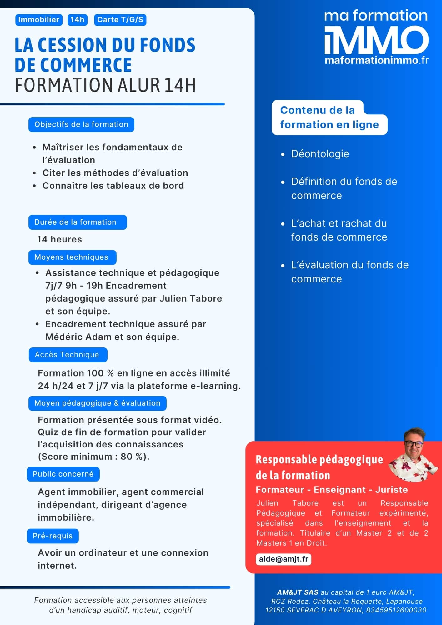 Votre tuteur pédagogique Tout savoir sur la cession et le fonds de commerce : Julien TABORE (master en droit privé – administration des affaires – droit international et européen et formateur senior).