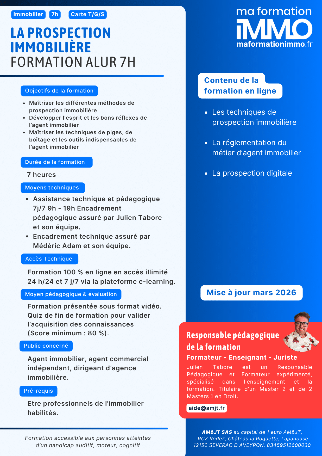 - La prospection immobilière, formation loi ALUR de 7h, est un art qui nécessite méthode et discipline. Beaucoup de professionnels de l’immobilier échouent à cet exercice, car ils ne sont pas préparés. Pourtant avec un peu d’organisation et quelques conseils, vous pourrez transformer l’exercice de la prospection en un retour gagnant.